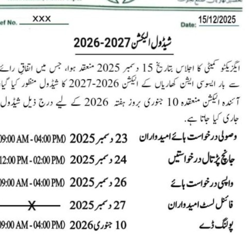 - 23 دسمبر 2025 کو امیدواران سے کاغذاتِ نامزدگی وصول کیے جائیں گے (صبح 9 بجے سے شام 4 بجے تک)