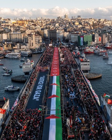خبررساں ایجنسی کے مطابق عوام آیا صوفیہ جامع مسجد سمیت شہر کی مختلف مساجد سے نماز فجر کے بعد قافلوں کی شکل میں گلاتا پل پہنچے اور ترکیے اور فلسطین کے پرچم اٹھا کر مارچ کیا۔