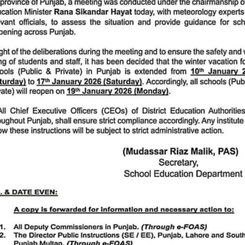 پنجاب کے تعلیمی اداروں کی چھٹیاں ایک ہفتہ بڑھا دی گئی